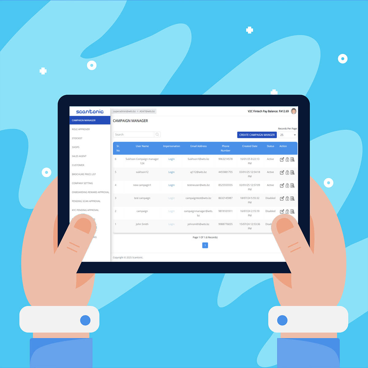 Easily manage all aspects of your operations from a single intuitive dashboard. Handle promotions, payments, customer data, and authentication effortlessly. Set daily limits across your stockists, distributors, retailers, and customers network.